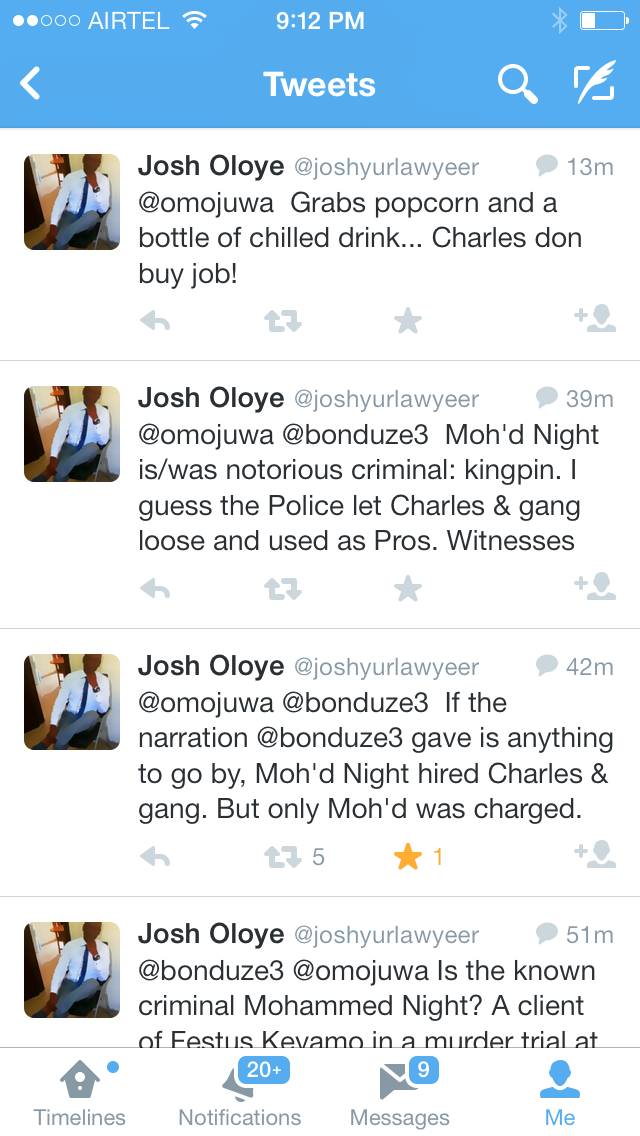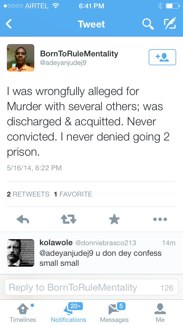It was in the midst of my tweets I got a fortuitous call from a celebrated Nigerian author whose name I’d rather keep out of this for now. The author informed me that I had to be careful with Adeyanju Deji – this was the first time I discovered @Adeyanjude9 ‘s real names – because he was once jailed for murder as a University student. This sounded outlandish so I kept pressing for details.
