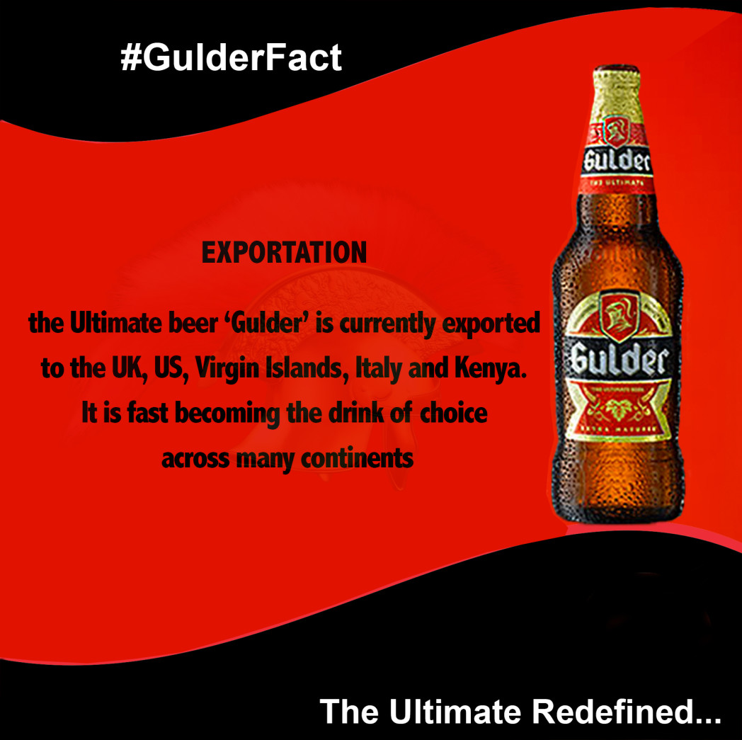 EXPORTATION: the Ultimate beer ‘Gulder’ is currently exported to the UK, US, Virgin Islands, Italy and Kenya. It is fast becoming the drink of choice across many continents