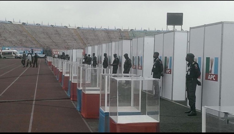 Here is a photo showing us a glimpse into the APC presidential primaries’ atmosphere. The ballot boxes are quite big, guarded by armed security personnel, plus there is a distinctive gap among ballot boxes; probably to ensure privacy among delegates.
