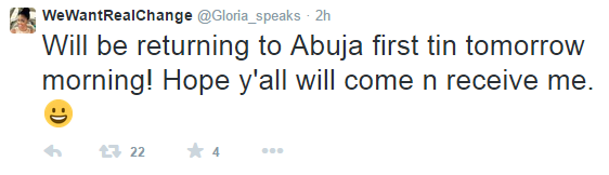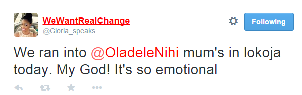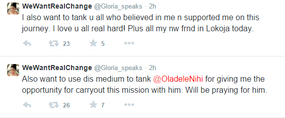 Gloria made headlines yesterday when she joined staunch President Jonathan’s supporter, Oladele John Nihi, and vowed to trek to Otuoke from Abuja. Sadly, she has called off her trek because her parents are so worried. Tweets and more photos of her at her last stop in Lokoja with John and his mum continue below…