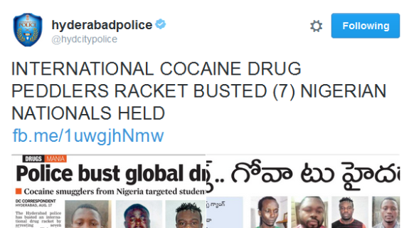 Task Force DCP B Limba Reddy said the Nigerians were arrested from two locations in the city and seized the cocaine and brown sugar which was meant to be delivered to customers. Police also seized two laptops, 15 cell phones from their possession besides cash worth Rs 33,600.The suspects came to India on business Visa and have established a drug network all over the metropolitan cities, and became part of an already-existing network of operatives of drug suppliers from Goa. Below is the full statement issued by Hyderabad City Police: