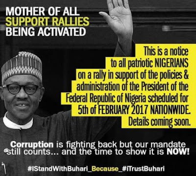 Pro-Buhari supporters announce solidarity rally Posted on January 31, 2017 by Staff Reporter Supporters of President Muhammadu Buhari are set to hold a rally on 5th February, 2017, same day Tuface Idibia will be leading an anti-Buhari protest. See protest flier: