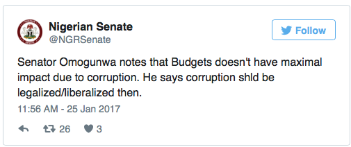 The Senator made the call during the debate on the 2017 budget. He said if corruption was legalised, Nigerians who stole public funds would use them in building factories and industries in the country, instead of having them stashed away abroad.
