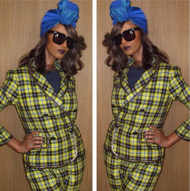 Well here is Iman, legendary fashion icon, inspiring us again with a mind blowing fashion mix. She beautifully clashed a multi coloured check corporate suit and a blue turban, with slamming dark shades.
