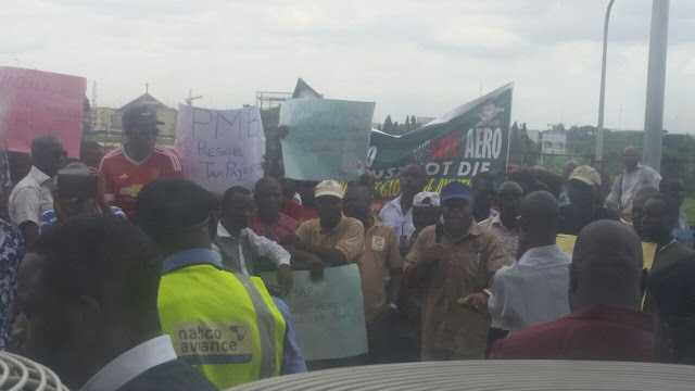 The placards had inscriptions such as, “Don’t Allow Aero to Die“, “Save Aero from AMCON“ and “Aero must not go the way of Nigeria Airways“, among others.