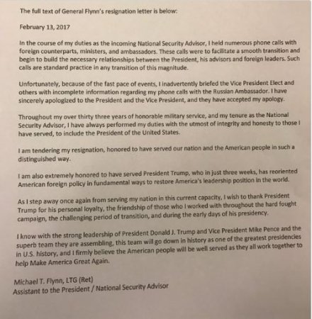 TELEGRAPH UK reports that Flynn submitted his resignation in a letter Monday evening. In his resignation letter, Mr Flynn said he held numerous calls with the Russian ambassador to the US during the transition and gave “incomplete information” about those discussions to Vice President Mike Pence.
